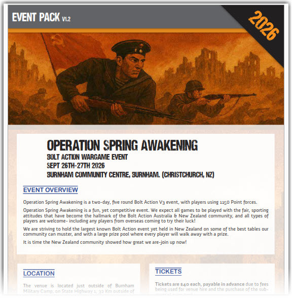 Hi All, I'm very pleased to announce that registration for the Bolt Action event; 'Operation Spring Awakening 2026', Sept. 26-27 in Christchurch (NZ) is now open, and the PDF of the event pack can be found below!